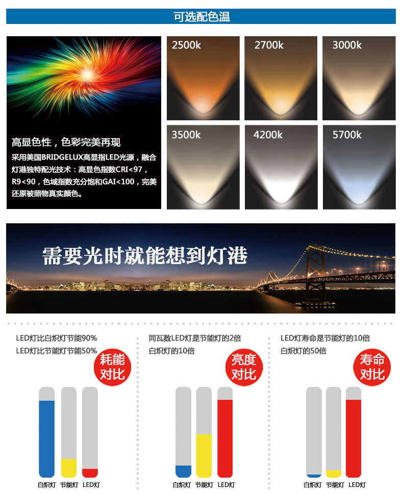 | 相关色温 | 暖白光2850K-3200K 中性白3700K-4200K 纯白光4700K-5300K | |||||
