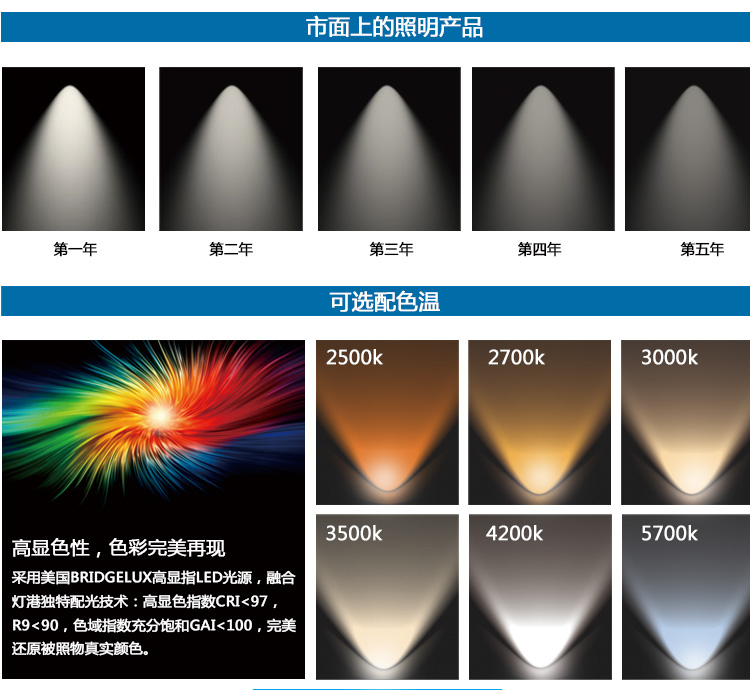 | 相关色温 | 暖白光2850K-3200K 中性白3700K-4200K 纯白光4700K-5300K | ||||||